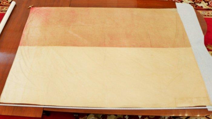 Bendera Merah Putih diletakkan dalam posisi tergulung dengan bagian atas bendera dilapisi dengan kertas bebas asam.