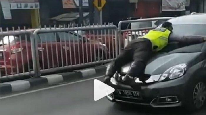 Sebuah video yang menunjukan seorang anggota polisi lalu lintas naik ke atas kap mobil Honda Mobilio berwarna abu-abu yang sedang berjalan viral di media sosial.