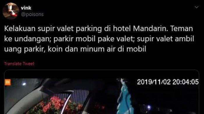 "Kelakuan supir valet parking di hotel Mandarin. Teman ke undangan; parkir mobil pake valet; supir valet ambil uang parkir, koin dan minum air di mobil" tulis akun Twitter @poisons di keterangan videonya.