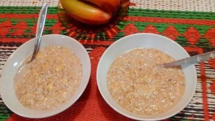 Santan matang, gula, dan garam dicampur dengan pisang, dan terakhir di tambahkan beras ketan yang telah disangrai.