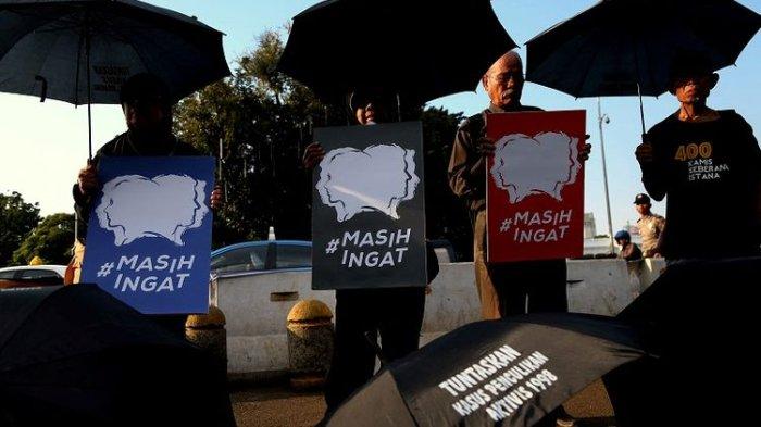 Dengan menggunakan atribut hitam-hitam dan payung hitam, Aksi Kamisan digelar di depan Istana Merdeka dengan damai. (1)