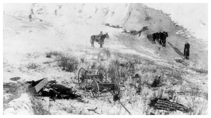 Diperkirakan 250-350 dari suku Indian Lakota tewas dalam Pembantaian Wounded Knee , 200 di antaranya wanita dan anak-anak.