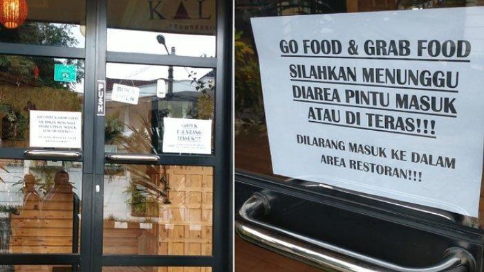 Pengumuman itu tertulis larangan untuk pengemudi ojek online masuk ke dalam restoran.