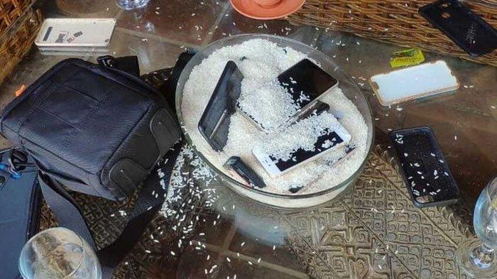 Ponsel-ponsel yang basah karena terendam air laut itu kemudian ditimbun dalam beras agar cepat mengering.