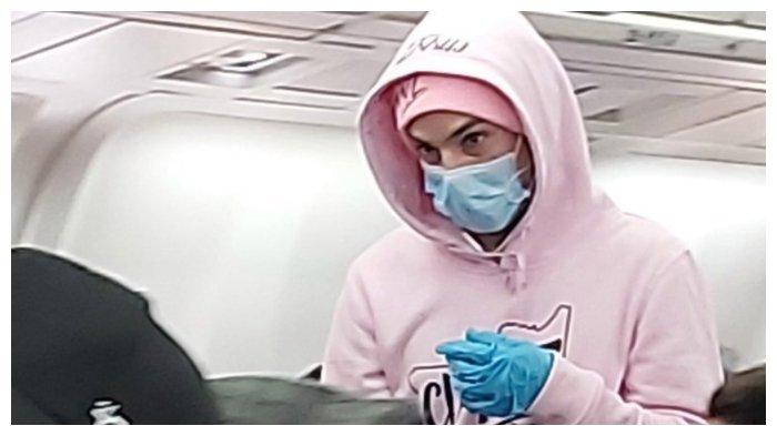 Ia turun dari pesawat dengan wajah yang tertutup masker.