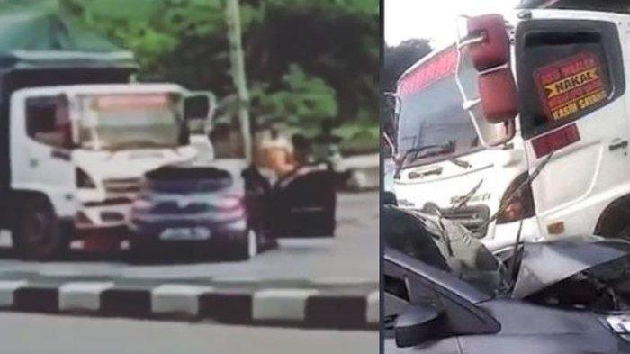 Kecelakaan yang melibatkan truk gandeng dan mobil Brio ini terekam salah satu warga yang ada di lokasi.