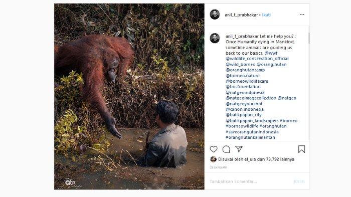 Dalam foto yang viral di sosial media itu tampak seekor orang utan mengulurkan tangan pada pria yang ada di sungai.