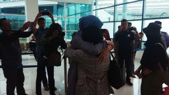 Ibu dari Nadia Ramadhannisa Saubari ini terlihat menangis saat pertama kali melihat anaknya keluar dari ruang terminal kedatangan.