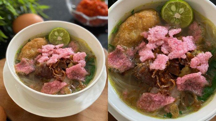 - Susun soun, tomat, daging goreng, dan perkedel kentang dalam mangkok saji, lalu siram dengan kuah dan taburi dengan bawang goreng, akhiri dengan memberi kerupuk pink.