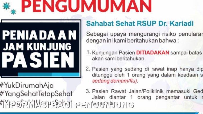 Diketahui Rumah Sakit Umum Pusat (RSUP) Kariadi telah mengeluarkan edaran pengumuman tentang diberhentikannya jam besuk atau jam kunjung pasien yang dirawat.