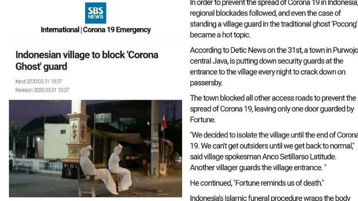 Menggunakan huruf Hangul, SBS merilis berita berjudul 'Pencegahan Covid-19, Desa di Indonesia Sampai Dijaga Hantu Pocong'.