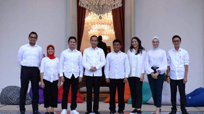 Presiden Joko Widodo mengenalkan tujuh orang sebagai Staf Khusus Presiden untuk membantunya dalam pemerintahan pada sebuah acara perkenalan yang berlangsung dengan santai di veranda Istana Merdeka, Jakarta Pusat, Kamis (21/11/2019) sore. Ketujuh staf khusus baru yang diperkenalkan Presiden Jokowi merupakan anak-anak muda berusia antara 23-36 tahun atau generasi milenial. Adapun ketujuh staf khusus baru yang diumumkan oleh Presiden Jokowi yaitu (kiri ke kanan) Andi Taufan Garuda Putra, Ayu Kartika Dewi, Adamas Belva Syah Devara, Gracia Billy Mambrasar, Putri Indahsari Tanjung, Angkie Yudistia, dan Aminuddin Maruf. Tribunnews/HO/Biro Pers Sekretariat Presiden/Kris