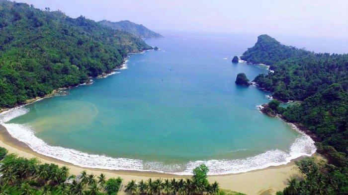 Sementara, pemandangan pantai ini cukup cekung karena di kanan dan kiri menjulang dua tebing karang.