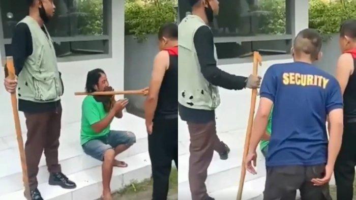 Tangkapan layar dari video seorang tukang becak yang dikira maling tengah dipukuli satuan pengamanan (satpam) di depan pos satpam Museum Keris Solo pada Jumat (17/4/2020) pukul 15.30 WIB.