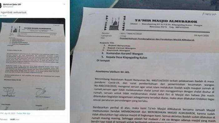 Surat yang beredar tersebut berkop TA'MIR MASJID ALMUBAROK yang beralamat di Rancabanteng RT 01/VII Dusun Klapagading Kulon-Wangon Banyumas, Jawa Tengah.