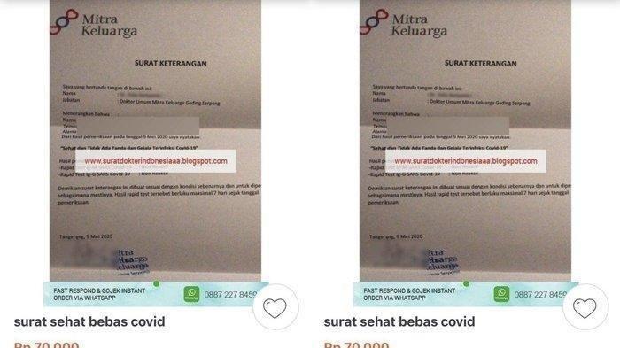 TRIBUNNEWSWIKI.COM - Viral beredar surat keterangan sehat bebas Covid-19 dari RS Mitra Keluarga dijual secara online seharga Rp 70 ribu, ternyata surat palsu.