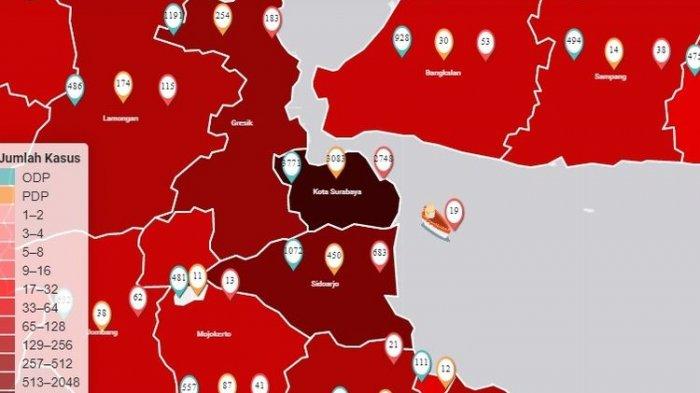 Di peta sebaran, warna lain yaitu merah pekat terdapat di wilayah Kabupaten Sidoarjo dengan 683 kasus dan Kabupaten Gresik 183 kasus.