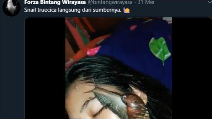 Video berdurasi 14 detik tersebut juga memperlihatkan siput tersebut berjalan di atas wajah sang perempuan.