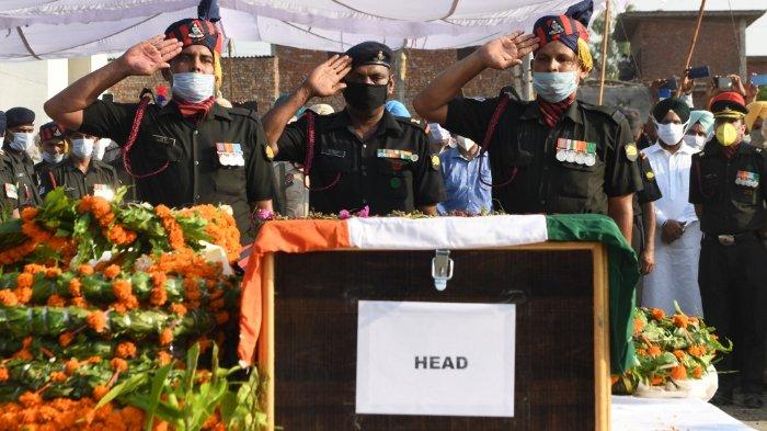 Pasca konflik selama 3 hari, pasukan China dilaporkan membebaskan 10 pasukan India, FOTO: Para perwira Angkatan Darat India memberi hormat setelah meletakkan karangan bunga di peti mati prajurit Satnam Singh yang terbunuh dalam bentrokan baru-baru ini dengan pasukan Cina di daerah lembah Galwan, selama upacara kremasi di desa Bhojraj dekat Gurdaspur pada 18 Juni 2020.