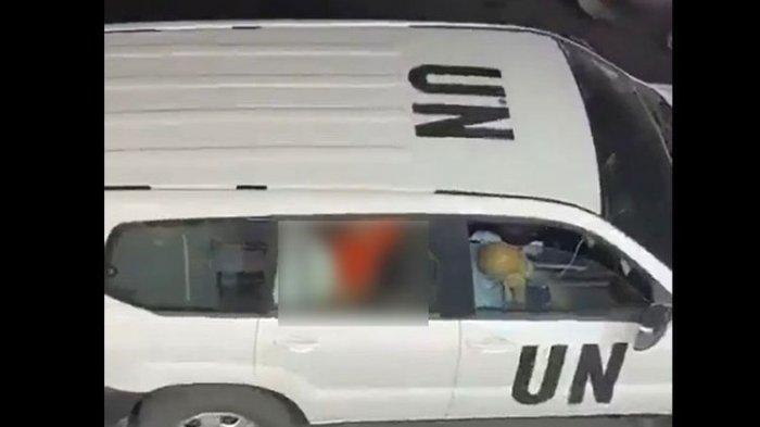 Atap dan pintu mobil itu terlihat bertuliskan UN (United Nations) yang merupakan nama PBB dalam bahasa Inggris.