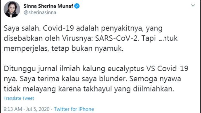 "Ditunggu jurnal ilmiah kalung eucalyptus VS Covid-19-nya," kata Sherina dikutip dari akun @sherinasinna, Senin (6/7/2020).