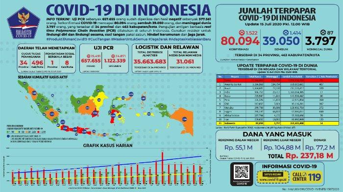 “Sehingga secara akumulatif ada 80.094 kasus positif Covid-19 (di Indonesia) sampai saat ini," kata Yurianto dalam konferensi pers di Graha BNPB, Rabu (15/7/2020) sore seperti dilansir oleh Kompas.com.