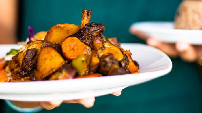 Wajah makhluk tersebut terlihat mengintip di sela-sela makanan sisa, menunjukkan giginya yang tajam dan bergerigi.