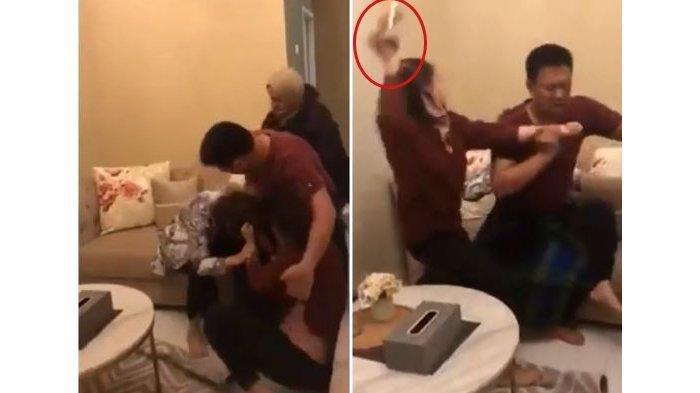 Wanita tersebut terlihat mengamuk pada sang suami hingga memukul kepala pelakor dengan sebuah toples hingga pecah.