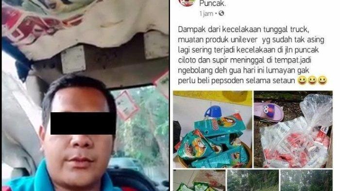 "Dampak dari kecelakaan tunggal truck, muatan produk unilever yang sudah tak asing lagi sering terjadi kecelakaan di jalan puncak ciloto dan supir meninggal di tempat. jadi ngebolang deh gua hari ini lumayan gak perlu beli pepsoden selama setahun (emoji)(emoji)(emoji)," tulis akun Facebook Atek Saprudin.
