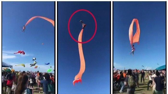 Pada festival yang diselenggarakan pada Minggu (30/8/2020) tersebut, terlihat seorang balita umur 3 tahun tersangkut ke salah satu layangan besar.