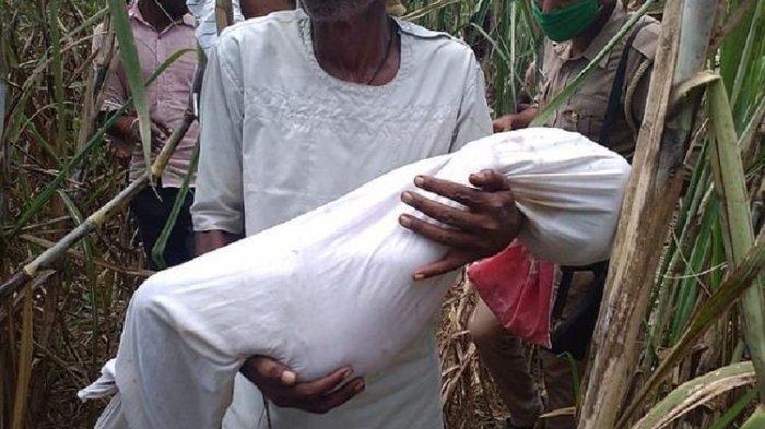 Jenazah bocah 3 tahun dibawa dari ladang yang berlokasi di Distrik Lakhimpur Kher, Uttar Pradesh, India. Bocah itu dilaporkan ditemukan setelah diperkosa dan dibunuh karena masalah rivalitas keluarga.( (Twitter via Daily Mail)