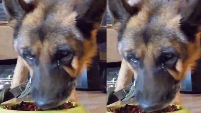 Anjing gembala Jerman itu tampak menangis dengan air mata mengalir di sudut matanya saat dia menyantap hidangan pedas itu.