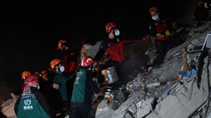 Tim penyelamat melakukan pencarian sepanjang malam pada hari Jumat dan Sabtu pagi untuk mencari korban selamat di antara puing-puing bangunan yang runtuh setelah gempa bumi dahsyat melanda pantai barat Turki dan sebagian Yunani [Ozan Kose / AFP]