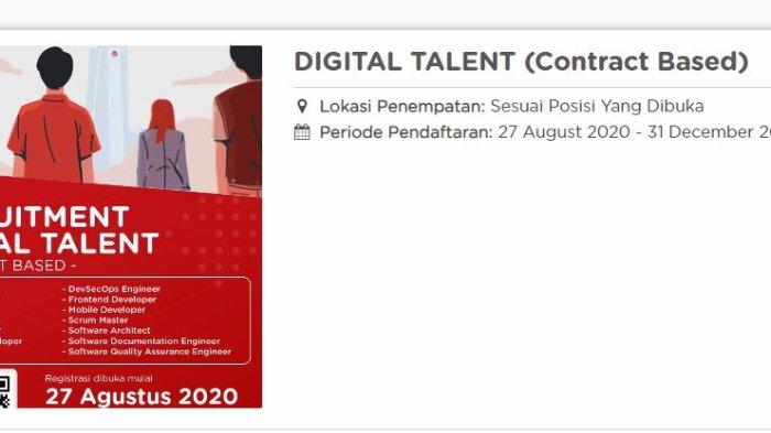 Saat ini PT. Telekomunikasi Indonesia, Tbk. atau Telkom Indonesia membuka lowongan kerja di banyak posisi untuk area Digital Talent yang dibuka sejak Agustus hingga Desember 2020 ini.