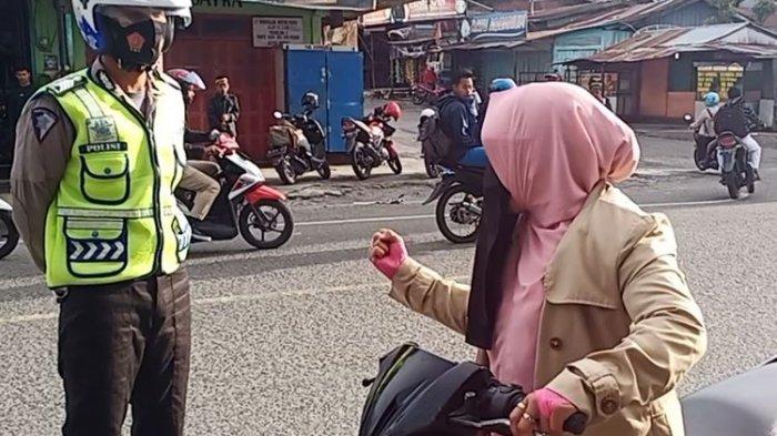Emak-emak itu tampak diberhetikan seorang petugas polisi di pinggir jalan.