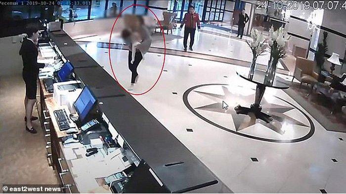 Wanita ini panik dan meminta tolong orang-orang yang berada di lobi hotel.