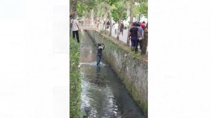 Ia yang jatuh ke selokan terus mengacungkan senjata tajam jenis golok kepada warga sekitar.