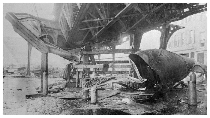 Banjir tetes tebu muncul dari tempat penyimpanan yang meledak di pabrik United States Industrial Alcohol Company.[1]