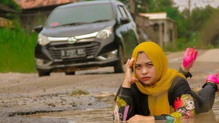 Foto-foto tersebut menampilkan pemilik akun Ummu Hani yang tengah bergaya seperti model di kolam renang. Namun, dengan kubangan di jalan rusak.