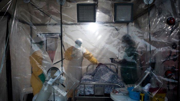 Dalam foto file ini diambil pada tanggal 15 Agustus 2018 Tiga petugas medis memeriksa seorang pasien Ebola di Unit Perawatan Darurat Biosecure (CUBE) pada tanggal 15 Agustus 2018 di Beni. Di Guinea, 3 kasus kematian baru akibat virus ebola telah menyebabkan negara di Afrika itu mengumumkan epidemi baru ebola.