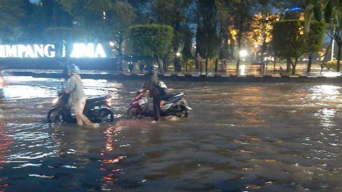 Sekitar 18.30 WIB, usai hujan reda, genangan air mulai surut di kawasan Simpang Lima.