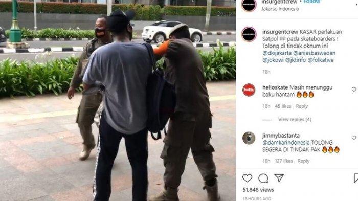 "KASAR perlakuan Satpol PP pada skateboarders! Tolong ditindak oknum ini @dkijakarta @aniesbaswedan @jokowi," tulis pemilik akun @insurgentcrew.
