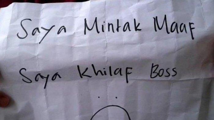 "Saya minta maaf, saya khilaf bos," begitu tulisan pada secarik surat tersebut, yang disertai emoji sedih atau penyesalan.