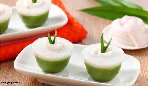 3. Tuang adonan putih ke atas adonan hijau yang sudah dikukus terlebih dahulu, isi hingga permukaannya penuh.