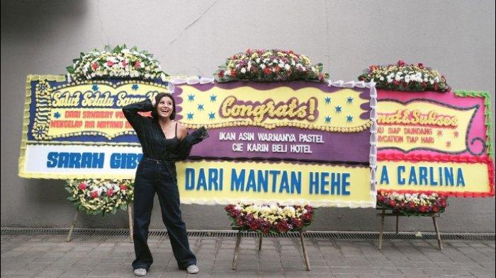 "Ikan Asin Warnanya Pastel, Cie Karin Beli Hotel, dari mantan," tulis salah satu karangan bunga yang difoto Awkarin.