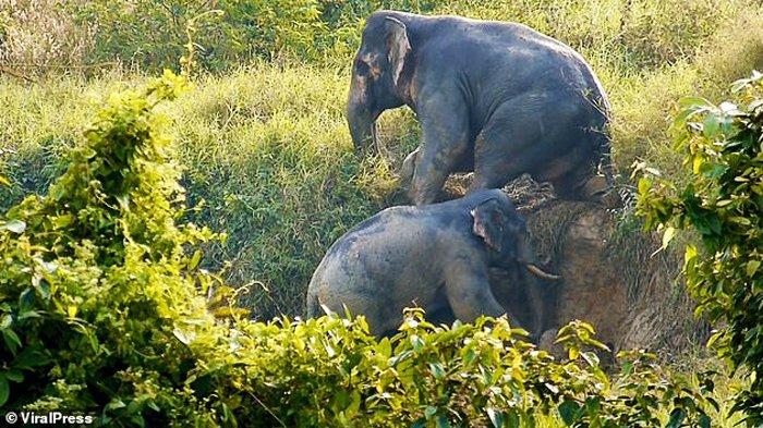 Salah satu gajah bertengger di kaki depannya di tepi lereng yang licin dan di atas rerumputan, sebelum gajah betina satunya mendorong punggungnya dengan lembut untuk mencoba membantunya keluar dari selokan.