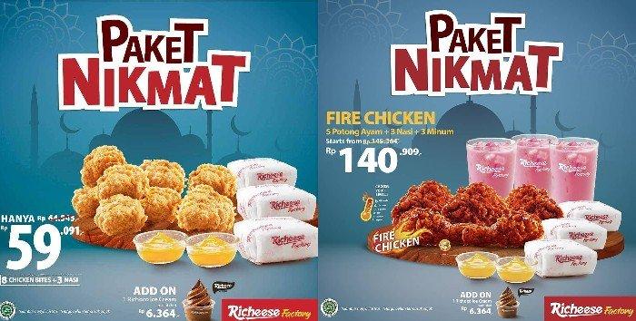 Untuk promo Paket Nikmat Chicken Bites, Richeese Factory juga membanderol 8 chiken bites+ 3 nasi hanya dengan harga Rp59.091.