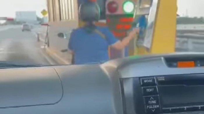 Aksi pengendara perempuan yang mengenakan kaos biru donker bercelana pendek dan berhelm hitam tersebut direkam dari dalam kabin seorang pengendara mobil yang mengantre di belakangnya saat akan mengisi e-toll di gerbang tol.