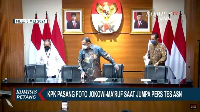 Foto Presiden Joko Widodo dan Wakil Presiden Maruf Amin terpasang pada salah satu dinding ruangan berdampingan dengan logo KPK. (Tangkapan Layar KompasTV)