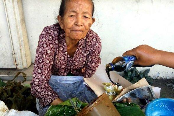 Dagangan Mbah Satinem cepat habis terjual sebelum jam sembilan pagi.